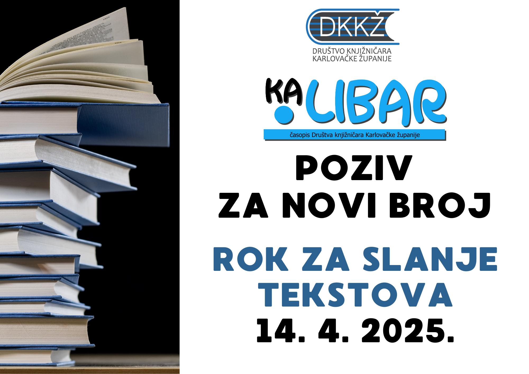 Hrvatsko knjižničarsko društvo objavljuje Javni poziv za dodjelu godišnjeg priznanja „Knjižnica godine“. Rok za prijavu je 1. rujna 2025. godine. Hrvatsko knjižničarsko društvo dodjeljuje priznanje „Knjižnica godine“ u svrhu poticanja kreativnosti, inovativnosti